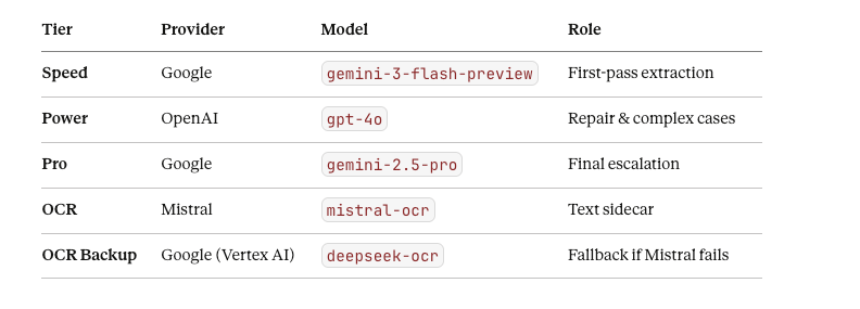 For each stage (extraction, repair-lite, final-repair) we applied series of fallbacks. As for each stage it can happen that some provider fill fail (e.g. due to general outage), then the process will continue with contingency provider. For example for Extraction stage we start with gemini-3-flash-preview, but if this provider is out, the process will fail over to gemini-2.5-flash, if this one is out as well, process will try gpt-4o. And often extraction will continue the normal process of validation and repairs.