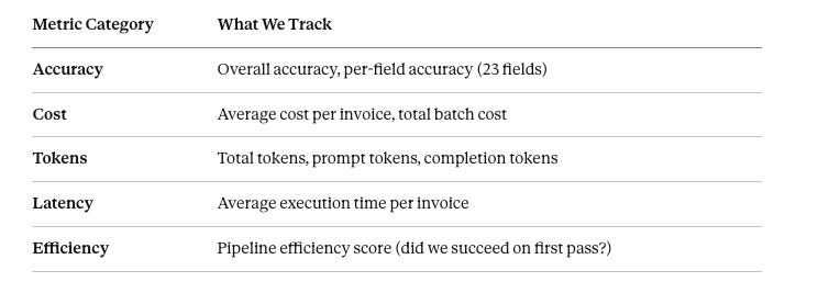In MLflow artifacts, we store per-invoice deltas so we can drill down into specific failures—if accuracy drops, we can see exactly which invoice and which field failed.